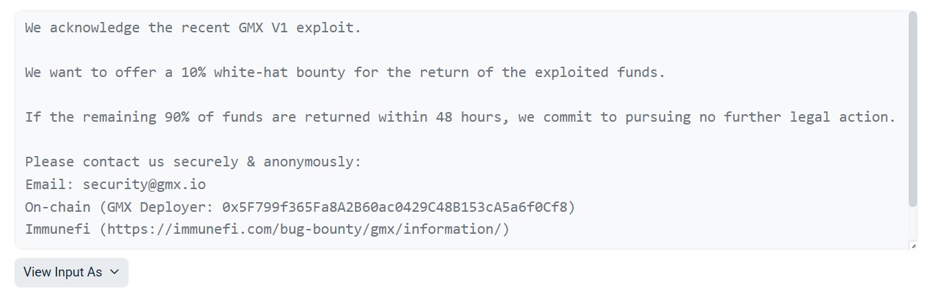 “Ви успішно виконали експлуатацію; ваші здібності в цьому очевидні для тих, хто розглядає транзакції з експлуатацією”, – написав GMX.”Баунті з білим капелюхом у розмірі 5 мільйонів доларів продовжує бути доступним”.