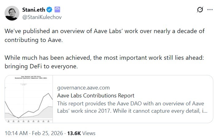 Засновник Aave Chan Initiative (ACI) Марк Зеллер у середу опублікував те, що він назвав звітом про прозорість, у якому розглядається історичне фінансування Aave Labs і застосовує структуру повернення інвестицій до минулих грантів DAO. Кілька годин тому Aave Labs опублікувала власний звіт про внески, в якому описується її роль у створенні протоколу з 2017 року.