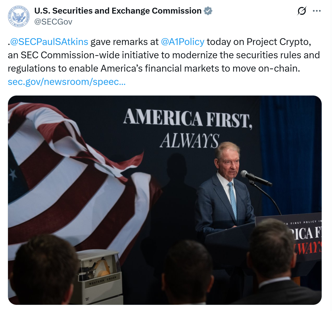 Відповідно до ініціативи криптовалюти проекту, SEC має на меті модернізувати свої правила цінних паперів для розміщення фінансових ринків на основі блокчейн. За словами Аткінса, робоча група президента на ринках цифрових активів вже доставила “сміливий план” для підтримки цієї місії.