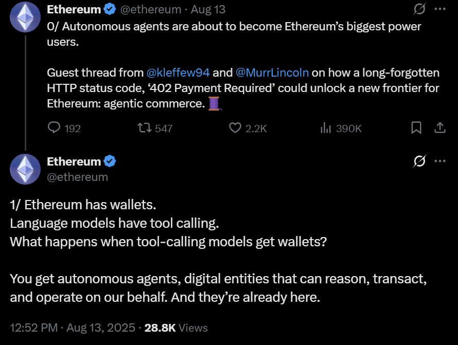 У серпні фундамент вказав на спокійний код стану HTTP 402 – який позначає “необхідний платіж” – і зазначив, що, поєднуючись з пропозицією eThereum удосконалення (EIP) 3009, це може дозволити агентам AI автоматично виконувати трансфери StableCoin.