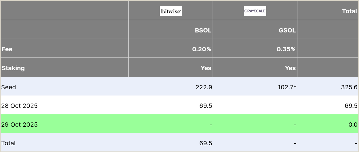 Згідно з даними Farside Investors, американський ринок ETF Solana наразі включає лише два продукти: Bitwise і Grayscale. Разом вони залучили $325,6 млн початкового капіталу, а Bitwise додав $69,5 млн надходжень у перший день торгів.