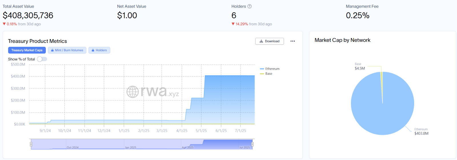 JTRSY-це активно керований фонд ONCHAIN, що забезпечує доступ до короткострокових казначейських рахунків США, також виданих через центрифугу. Він має понад 408 мільйонів доларів активів, багато в чому на Ethereum.