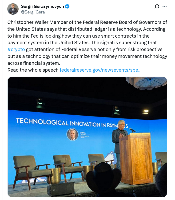 Коментарі Уоллера відображають стійкий поворот ФРС щодо прийняття криптовалюти та його майбутньої ролі в американській системі платежів. У квітні він відкликав рекомендації з 2022 року, які послужили для стримування банків від участі в діяльності криптовалюти та стабільної діяльності.