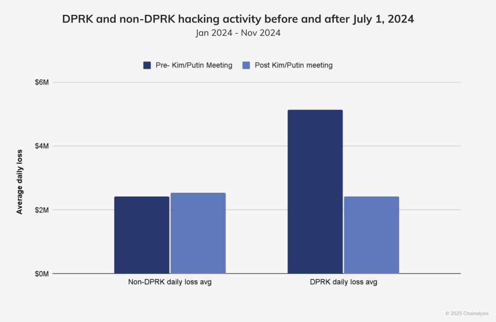 За даними аналітичної компанії Chainalysis, яка займається блокчейном, незаконна діяльність, пов’язана з північнокорейськими кіберакторами, різко знизилася після 1 липня 2024 року, незважаючи на сплеск атак на початку того ж року.