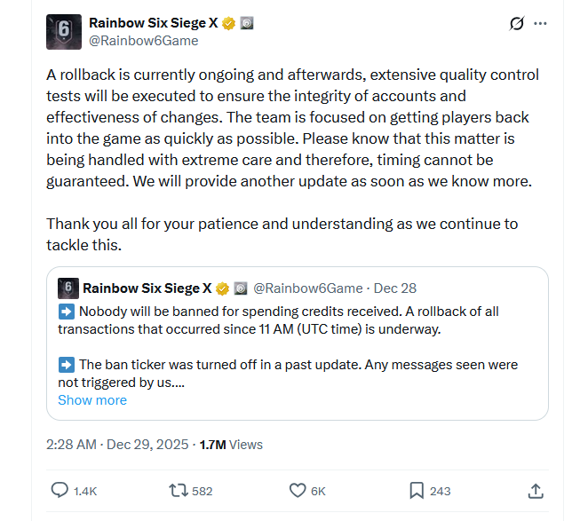 У дописі X від 28 грудня команда Rainbow Six Siege оголосила, що працює над анулюванням внутрішньоігрових кредитів, отриманих після 11:00 за UTC.