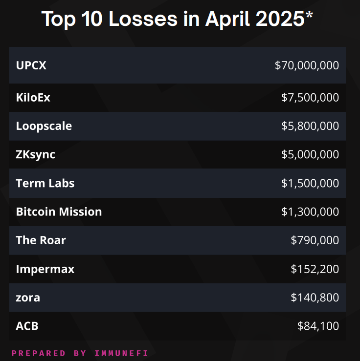 Найбільший злом на платформі UPCX на відкритому коморі у квітні припадає більшу частину збитків у квітні, що має понад 70 мільйонів доларів втрат, а Кілоекс втратив 7,5 мільйонів доларів як другий за величиною хак.