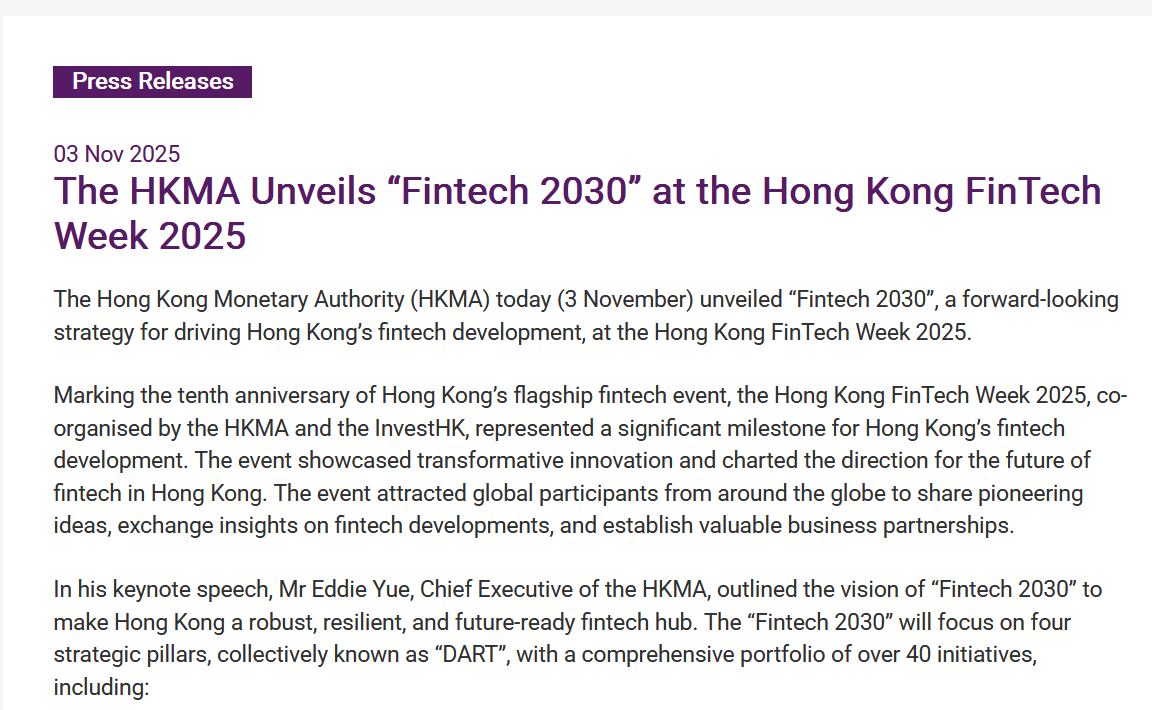 У заяві в середу під час Гонконгського тижня фінансових технологій HKMA заявила, що її стратегія Fintech 2030 буде зосереджена «на чотирьох стратегічних стовпах», які називаються «DART», охоплюючи дані, штучний інтелект, стійкість і токенізацію в рамках 40 ініціатив.