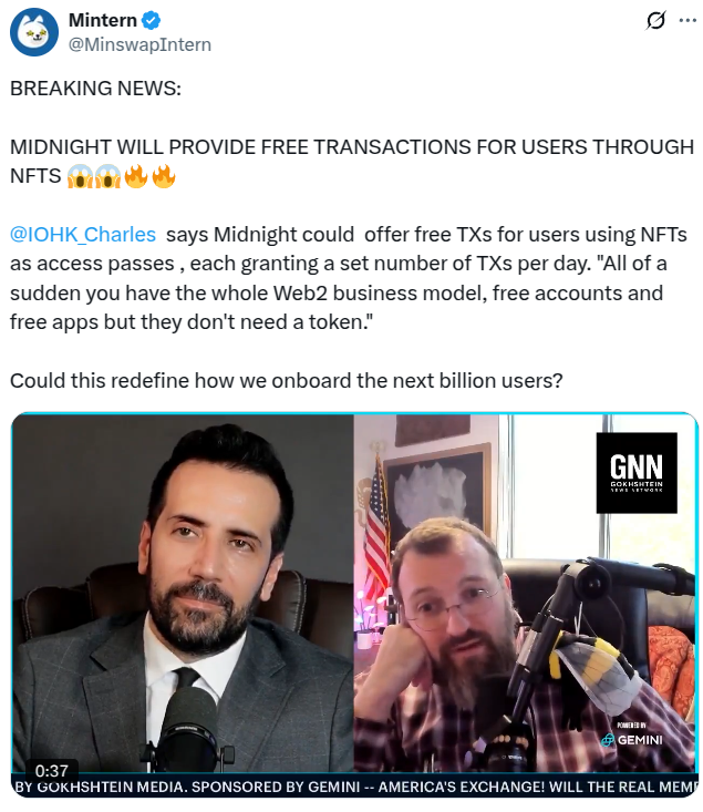 Midnight-це орієнтована на конфіденційність карданою. Нещодавно генеральний директор вхідного виходу Чарльз Хоскінсон також припустив, що мережа також може забезпечити безкоштовні транзакції для власників квитків, що не відповідають неможливим (NFT).