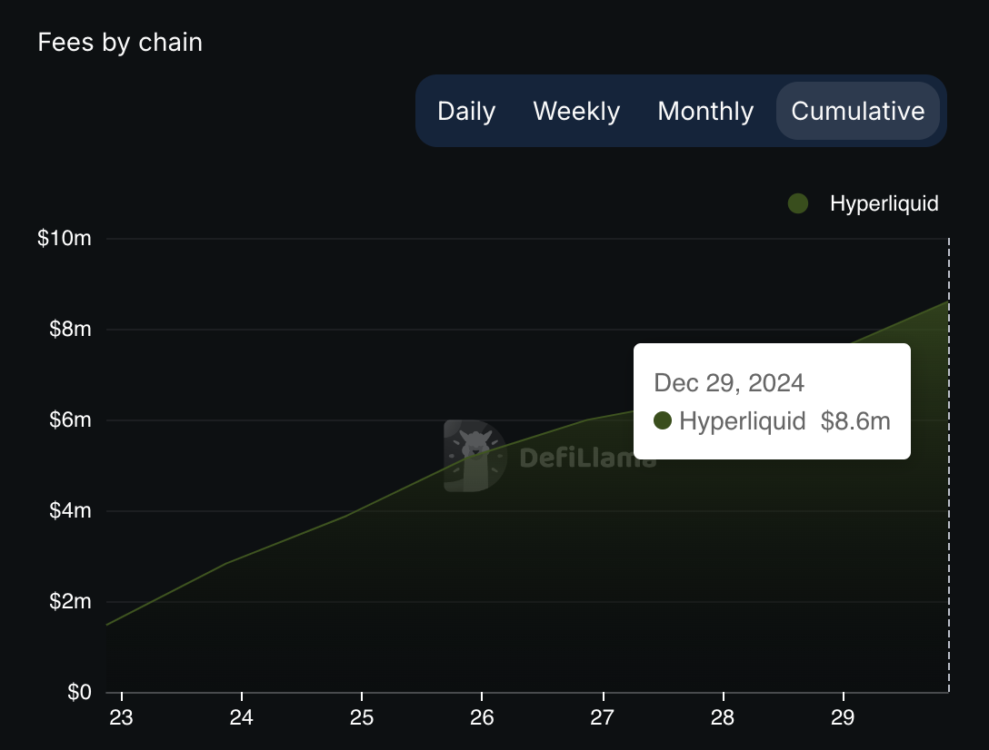Протокол Hyperliquid пропонує децентралізовану торгівлю активами криптовалюти. Згідно з даними DefiLlama, у грудні він накопичив понад 12 мільярдів доларів США в обсязі торгів, отримавши понад 8,6 мільйонів доларів сукупного доходу.