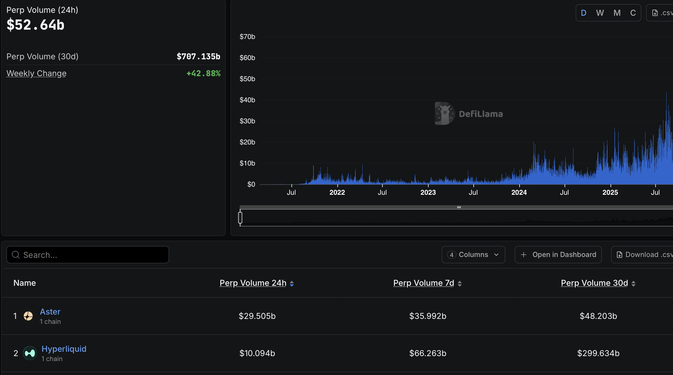 У середу дані Defillama показали, що щоденний постійний обсяг торгів Астера закривався на 30 мільярдів доларів, що більше ніж удвічі збільшившись гіперлікішою, яка зафіксувала близько 10 мільярдів доларів на момент написання.