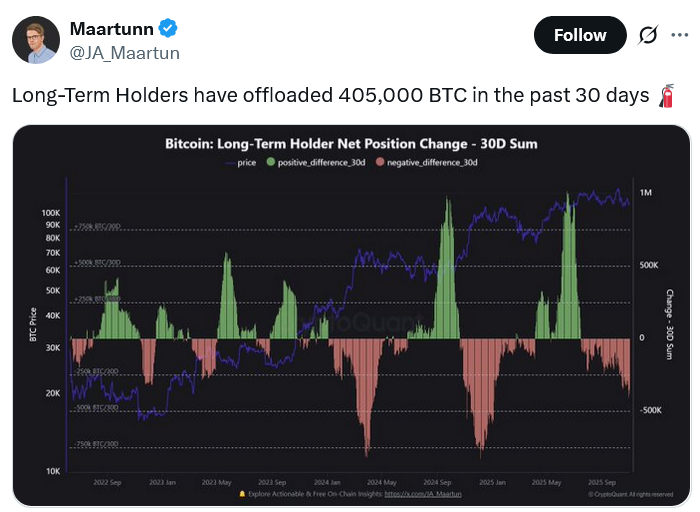 Дані CryptoQuant також показують, що довгострокові власники розвантажили 405 000 біткойнів приблизно з 2 жовтня по 2 листопада.