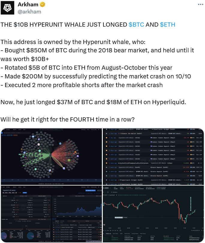Криптовалютна аналітична платформа Arkham була однією з перших, хто визначив нові довгі позиції Whale у публікації X у понеділок, яка складається з довгої позиції біткойн на 37 мільйонів доларів США та довгої позиції ефіру на 18 мільйонів доларів на децентралізованій біржі деривативів Hyperliquid.