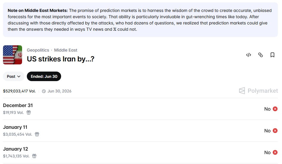 Ставки на удари США в Ірані на даний момент принесли 529 мільйонів доларів на Polymarket. Минулого місяця трейдер Polymarket заробив близько 400 000 доларів на своєчасній парі на захоплення президента Венесуели Ніколаса Мадуро.