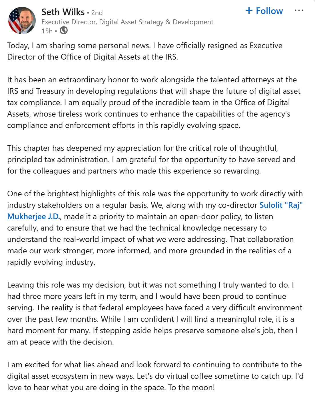 Тернер, який провів понад 20 років в IRS і останнім часом обіймав посаду старшого радника в офісі цифрових активів, тепер очолить підрозділ, згідно з повідомленням податку Bloomberg, що посилається на особу, знайомій із ситуацією.