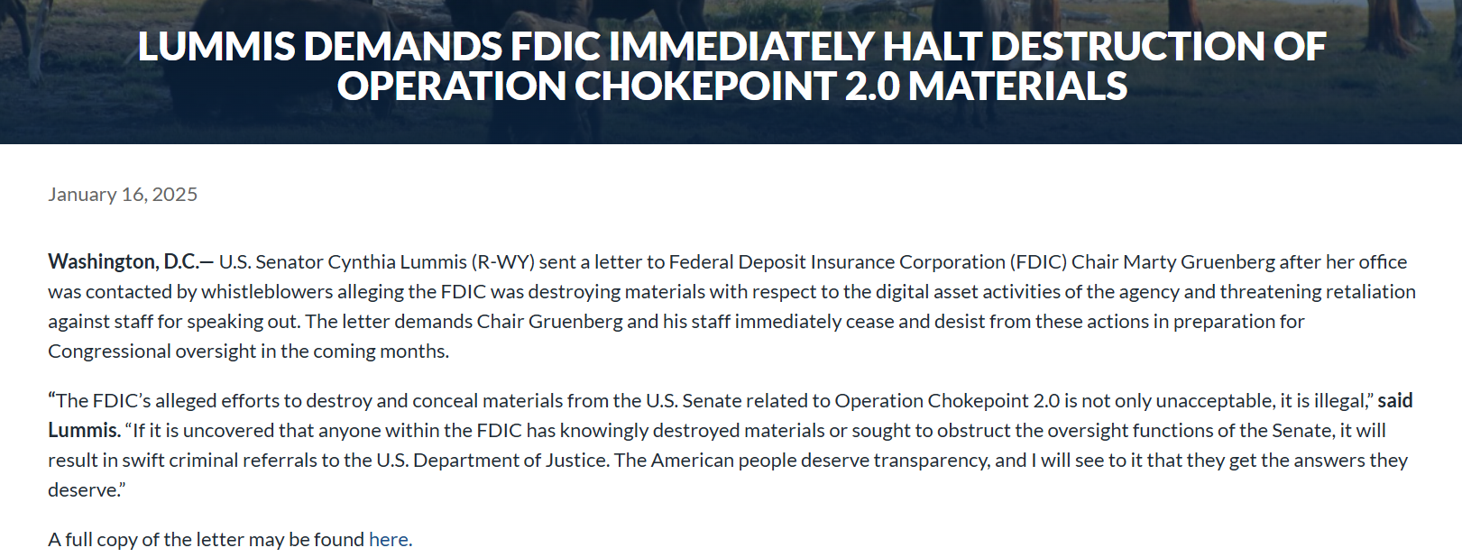 «Передбачувані спроби FDIC знищити та приховати матеріали від Сенату США, пов’язані з операцією Chokepoint 2.0, є не тільки неприйнятними, але й незаконними», — сказав Ламміс у листі, опублікованому 16 січня, погрожуючи «швидкими кримінальними справами», якщо правопорушення буде виявлено.