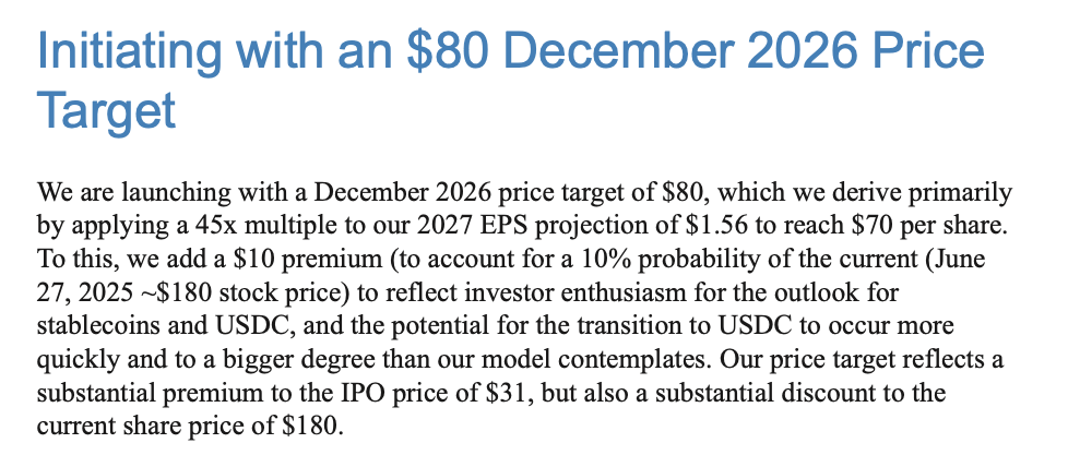 Знизившись на 55% від поточної ціни CRCL в 180 доларів, прогнозована ціль базується на 45 -кратному кратному прогнозованому 2027 прибутку на акцію (EPS) плюс 10 доларів США за потенціал зростання.