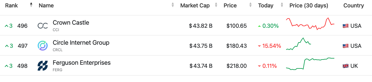 За даними CompaniesMarketCap, Circle оцінюється в 43,8 мільярда доларів, показуючи масове зростання після того, як акції CRCL почали торгувати на Нью -Йоркській фондовій біржі (NYSE) з ринковою обмеженням на 8 мільярдів доларів 5 червня.