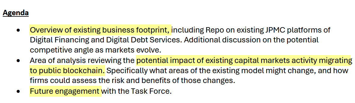 Порядок денний у дискусії про цифрові активів, що проводиться між JPMorgan та цільовою групою криптовалюти SEC. Джерело: сек