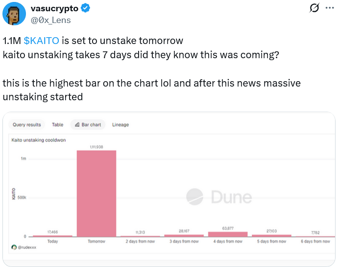 Понад 1 мільйон токенів KAITO планується зняти зі ставок у п’ятницю, що в 20-30 разів більше, ніж зазвичай, і оскільки період скасування ставок займає сім днів, деякі криптовалютні аналітики припустили, що це може означати, що інсайдери отримали ранню інформацію про заборону.