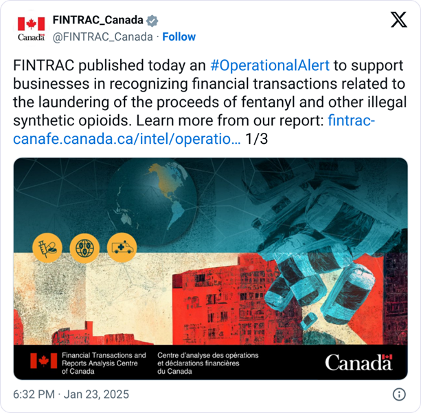 23 січня Фінтрак, Національне агентство з фінансової розвідки Канади, опублікував нові фактори ризику клієнта та показники синтетичного торгівлі опіоїдами та виробництвом для боротьби з відмиванням грошей незаконних коштів, пов’язаних з проблемою в країні.