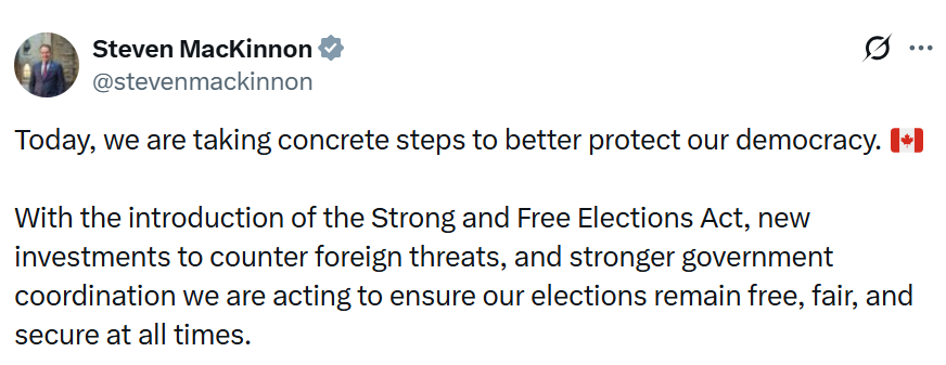 Спонсор законопроекту Стівен Маккіннон, лідер уряду в Палаті громад, заявив у заяві X у четвер, що ці заходи спрямовані на блокування іноземного втручання та інших загроз у вибори.