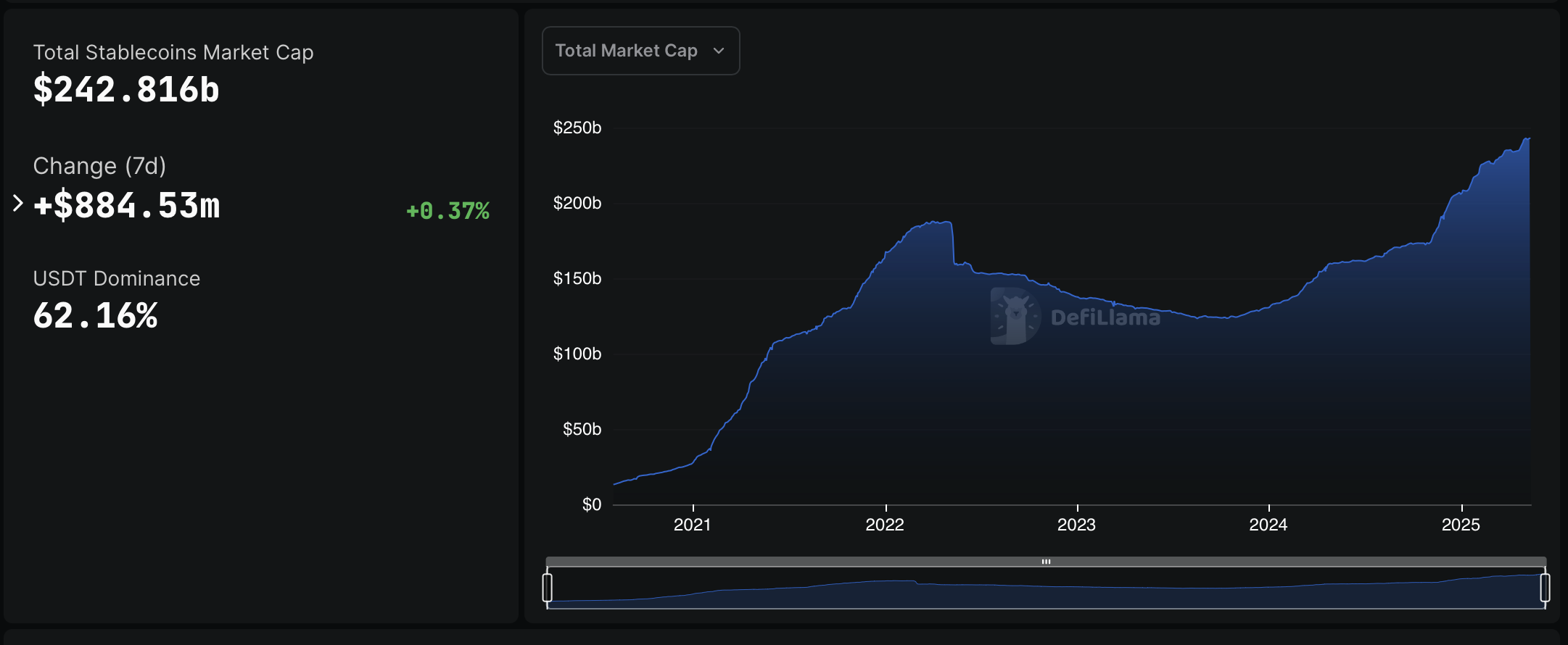 Стаблеки, криптовалюти, пов’язані з фіатною валютою, стали ключовим випадком використання цифрових активів. За даними Defillama, нинішня ринкова капіталізація для всіх стабільних досліджень становить 242,8 мільярда доларів станом на 14 травня, що на 51,9% за останні 12 місяців.