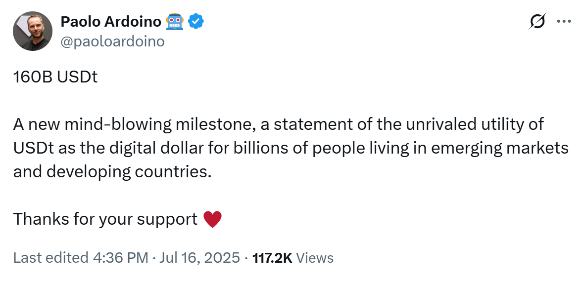 Ринкова шапка USDT Tether, найбільша у світі StableCoin, вперше перевершила 160 мільярдів доларів, «нова вражаюча віха», повідомляє генеральний директор Tether Paolo Ardoino.