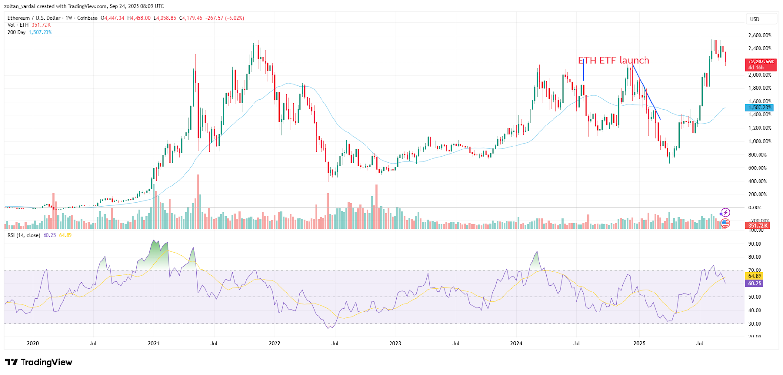 За останні шість місяців Ether зросла приблизно на 108% і торгувався на рівні 4177 доларів на момент написання, показують дані TradingView.