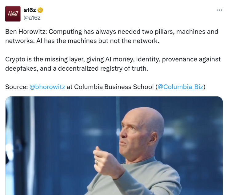 “Якщо ви ШІ, вам не дозволяється мати кредитну карту”, – сказав Горовіц у вівторок X Post.”Криптовалюта – це як економічна мережа для ШІ”, – додав він.