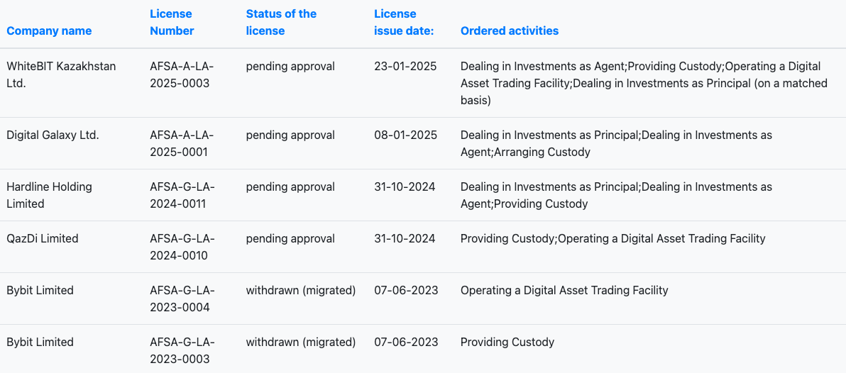 Згідно з громадським реєстру постачальників послуг цифрових активів, які підтримують Адміністрацію фінансових послуг Astana (AFSA), на час публікації було затверджено 20 платформ криптовалют.