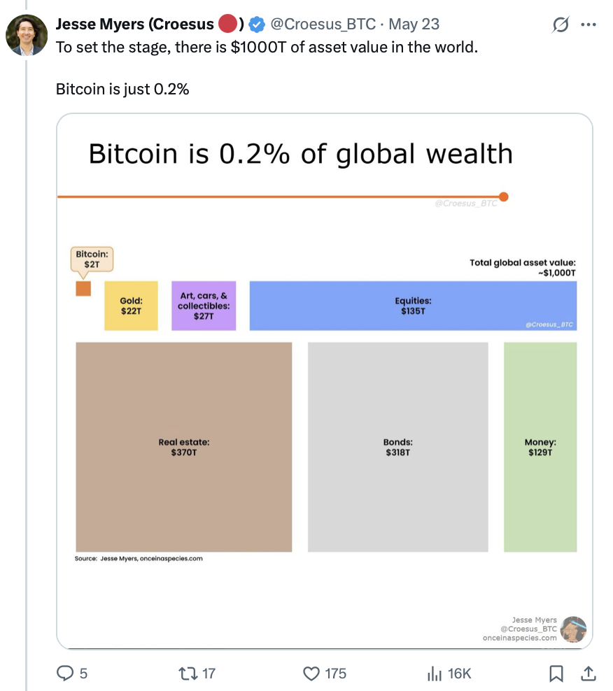 Майєрс сказав: “Щоб поставити підґрунтя, у світі є 1000 доларів вартості активів”. Він додав, що біткойн становить лише 0,2% від загальної кількості. Він пояснив, що оскільки половина всього капіталу у світі по суті шукає найкращого магазину вартості, цей капітал з часом “осмотично перетікає” в біткойн.