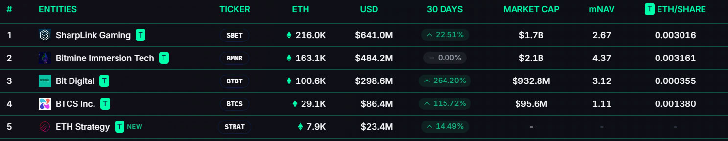 Інші компанії, які нещодавно придбали Ethereum для корпоративних казначейства, включають цифрову платформу Asset Bit Digital, з більш ніж 100 000 ETH та Blockchain Technology Consensus Solutions (BTCS), які зібрали 62,4 млн. Дол.