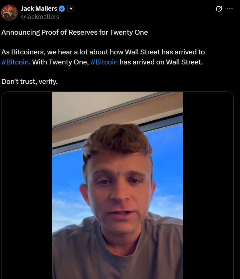 Двадцять один генеральний директор Джек Малерс також оголосив, що компанія запускає докази резервів, публічної книги, яка підтверджує свої казначейські холдинги Bitcoin.