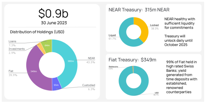 Згідно зі звітом від 10 липня, Near Treasury на даний момент складається з 349 мільйонів доларів США у формі фіату, 315 мільйонів доларів США у формі NEAR та 90 мільйонів доларів США у вигляді позик та інвестицій. Загалом у другому кварталі в екосистему було розподілено 16 мільйонів доларів США та 1 мільйон NEAR. Для порівняння, у першому кварталі 2023 року Near Treasury склав 1,1 мільярда доларів США. Розробники написали: