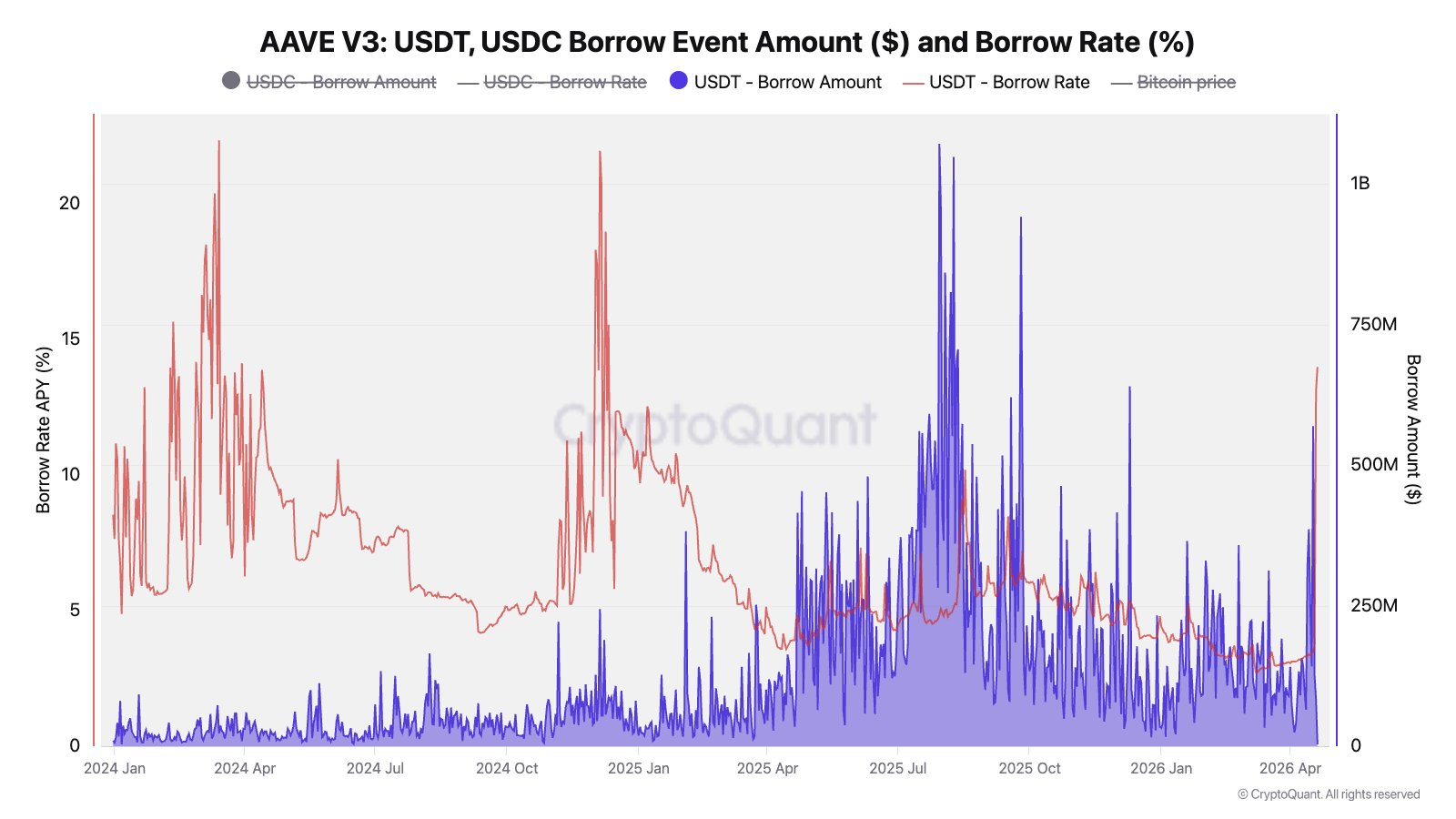 Водночас зменшення ліквідності призвело до того, що ставки запозичень Aave для USDt (USDT) зросли з 3% до 14%, що є найвищим показником із грудня 2024 року, написав Хуліо Морено, керівник відділу досліджень аналітичної платформи CryptoQuant, у публікації X у понеділок.