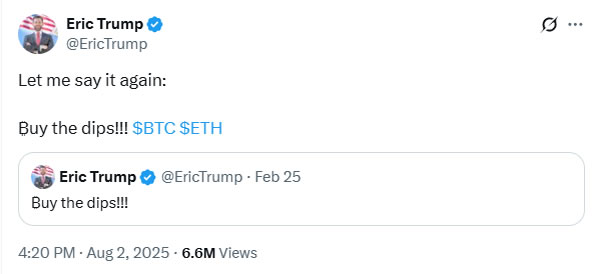 У вихідні Ерік Трамп, син президента США Дональд Трамп, сказав своїм X -послідовникам придбати ETH Dip.