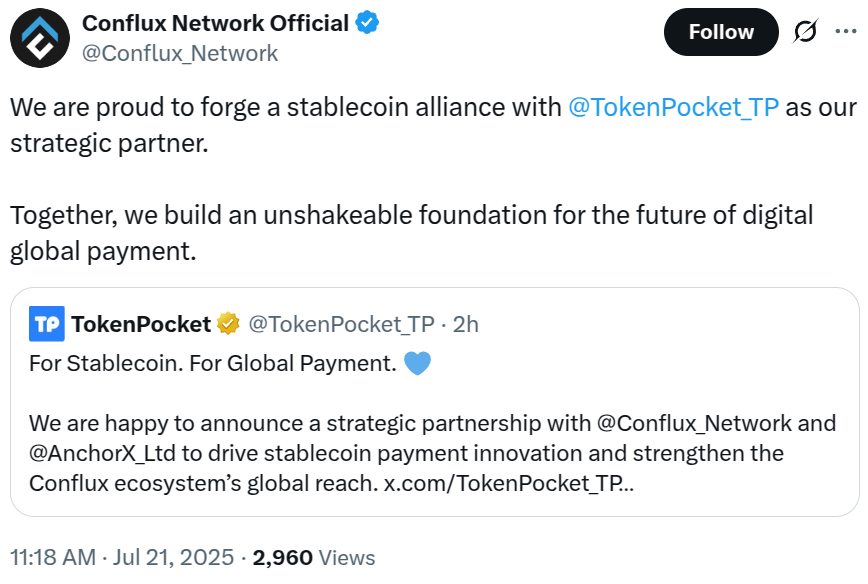 Conflux також співпрацював з криптовалютою Thenket, щоб сприяти стаблекуїну для своїх користувачів. У оголошенні X команда гаманця написала, що фірма запустить пілотні проекти в Центральній Азії, Південно -Східній Азії та інших ключових регіонах у партнерстві з Conflux та Anchorx.