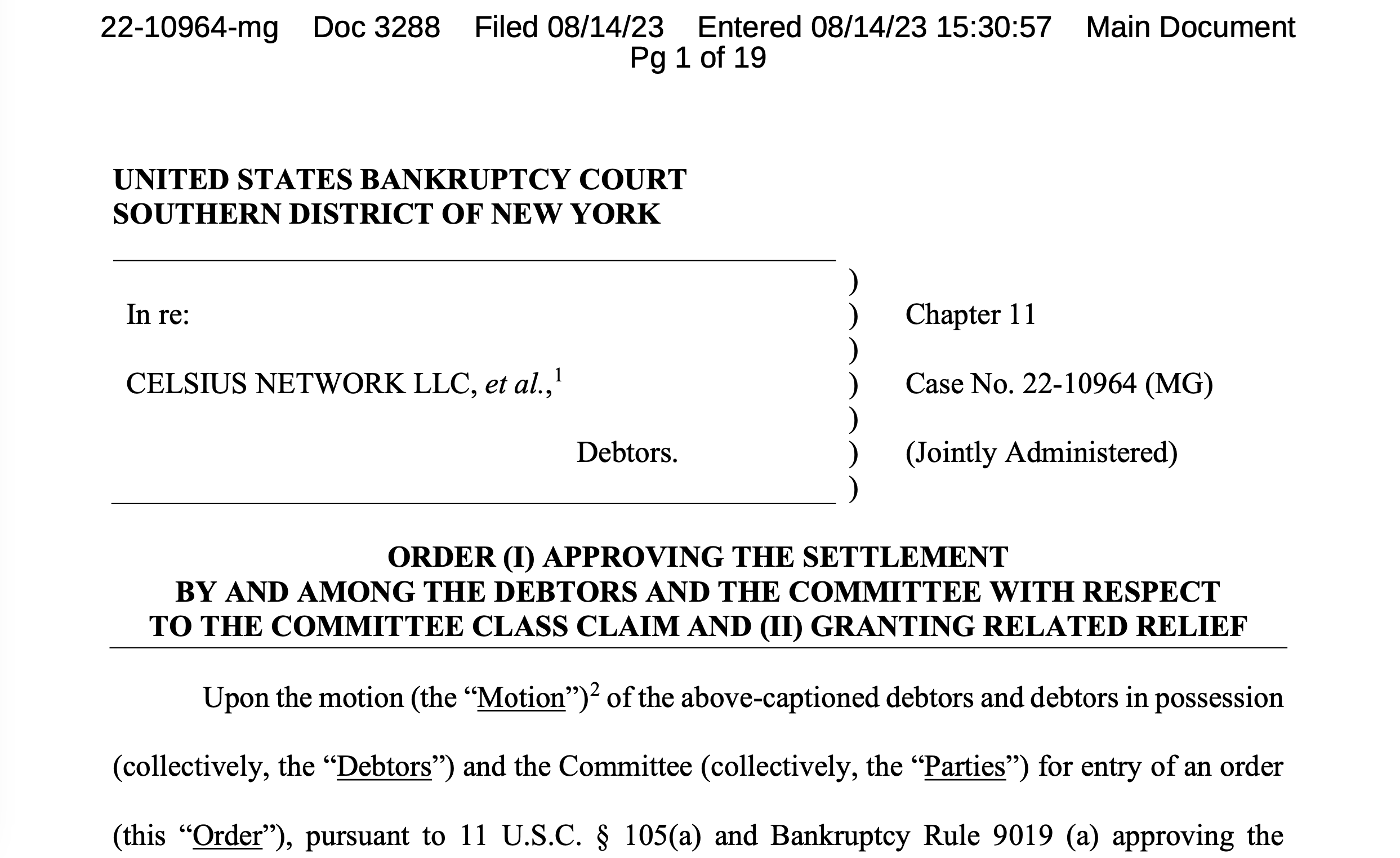 Суддя Мартін Гленн із суду з питань банкрутства Південного округу Нью-Йорка схвалив прохання дозволити клієнтам Celsius голосувати за врегулювання групових претензій для відшкодування учасникам програми Celsius Earn, а також збільшити відшкодування клієнтів на 5% для вирішення претензійщодо шахрайства та введення в оману з боку керівництва Celsius.