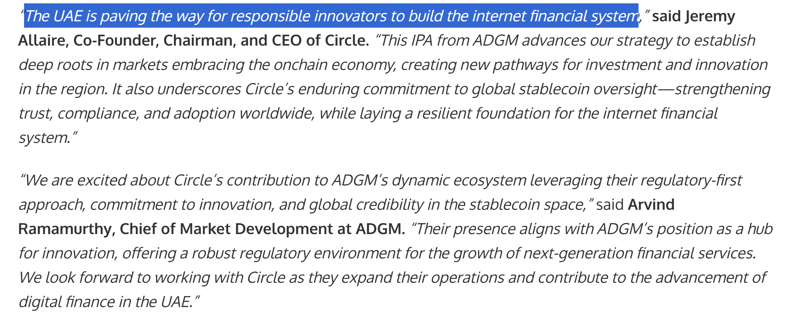 Окрім регуляторного прогресу, Circle оголосило про партнерство з HUB71, технологічною екосистемою Абу -Дабі. У рамках співпраці дві фірми планують спільно працювати над проектами в рамках цифрової регуляторної пісочниці ADGM.