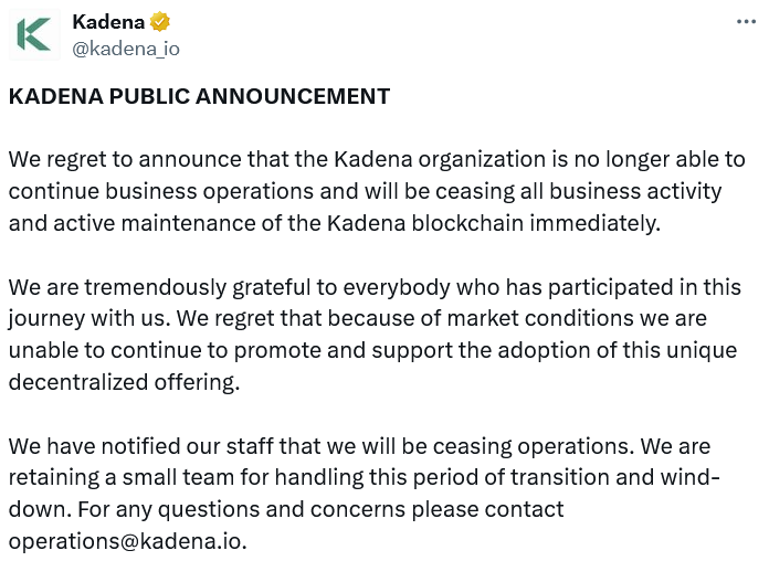 У дописі для X у вівторок Kadena заявила, що «більше не може продовжувати бізнес-операції та негайно припинить будь-яку бізнес-діяльність і активне обслуговування блокчейну Kadena».