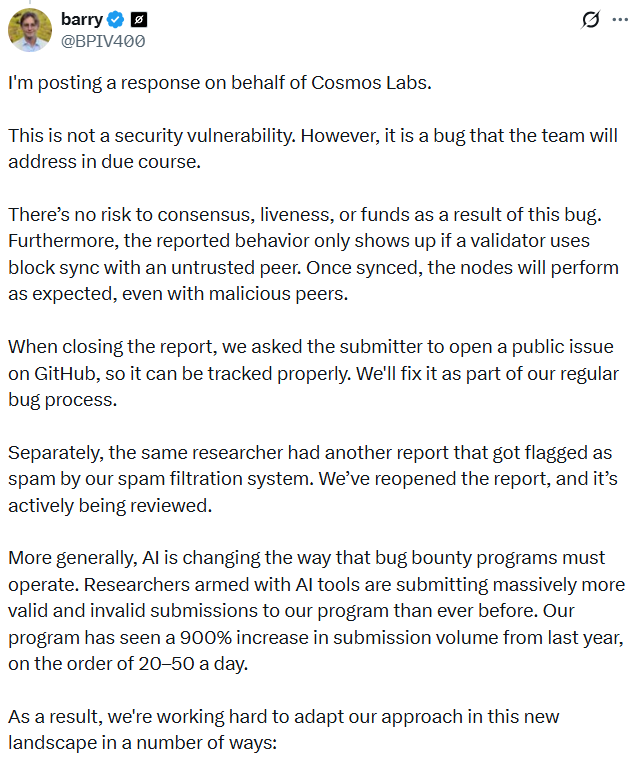 Планкетт сказав, що Cosmos Labs уже почала адаптувати свій підхід у зв’язку зі збільшенням кількості повідомлень про винагороду за помилки, посиливши оцінку подання, надавши пріоритет перевіреним дослідникам із підтвердженою репутацією та співпрацюючи з іншими постачальниками винагород за помилки, які пропонують більш просунуте сортування.