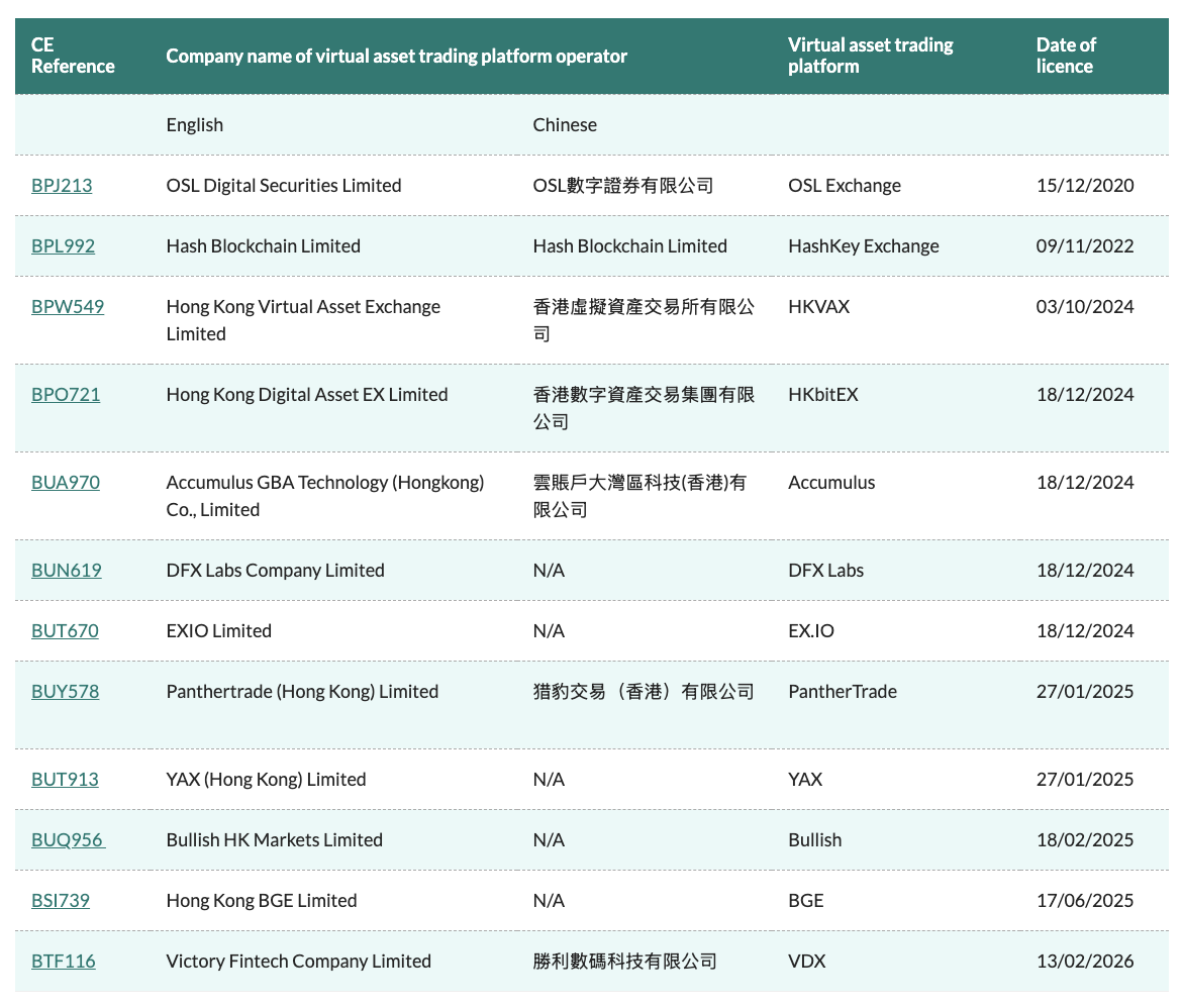 Список ліцензованих платформ для торгівлі віртуальними активами SFC включає Victory Fintech Company Limited як останню з 12 криптовалютних і блокчейн-компаній на веб-сайті регулятора Гонконгу. Додавання Victory стало першим з червня 2025 року, коли SFC схвалила платформу для торгівлі криптовалютою в Гонконзі.