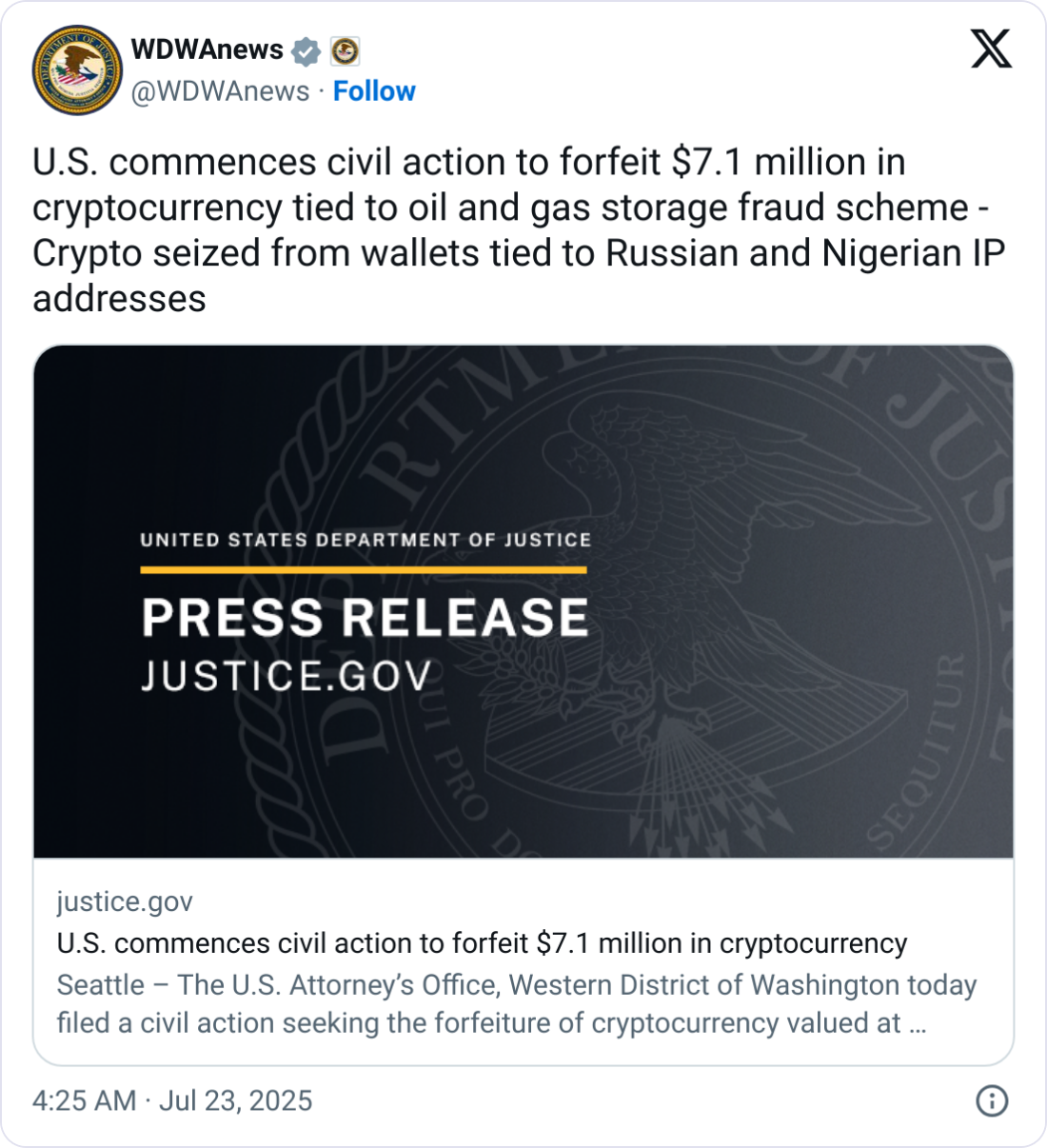 У вівторок прокуратура США в Сіетлі заявила, що подав цивільний позов про те, щоб здійснити конфіскацію деяких 97 мільйонів доларів, прийняті за передбачуваною схемою, яка тривала між червня 2022 по липень 2024 року.