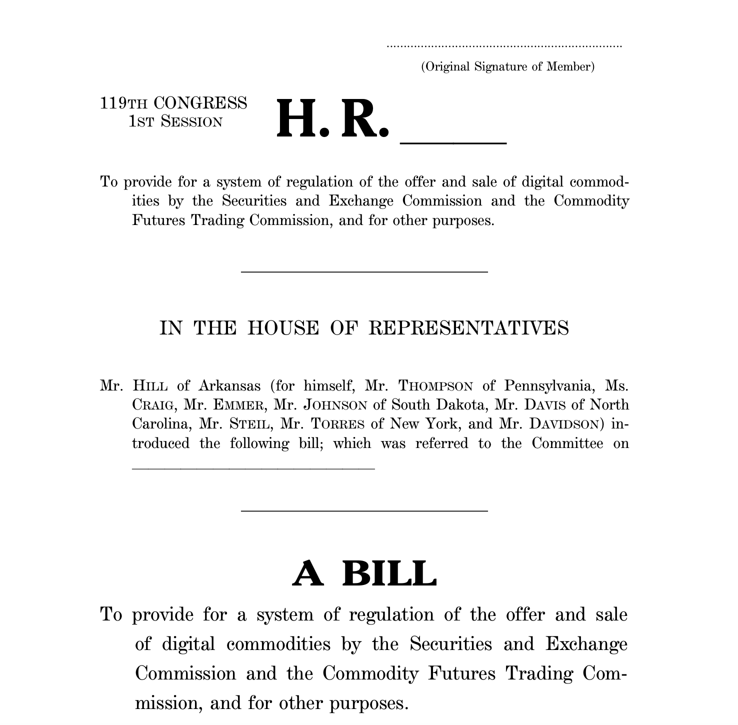 Представник США Французький Хілл оголосив про введення довгоочікуваного законопроекту про структуру ринку для цифрових активів.”Закон про чіткість ринку цифрових активів 2025 року” або “Закон про чіткість 2025 року” надає підтримку законодавців по всій сторонах проходу, включаючи трьох демократичних спонсорів.