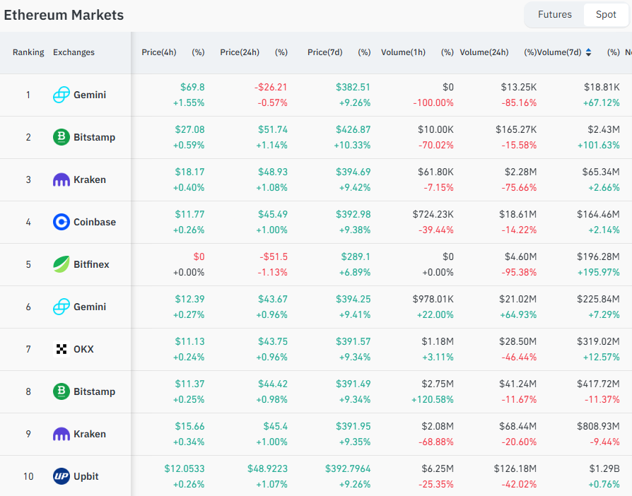 Дивлячись на ф’ючерсні дані, UPBIT посіла 10 -й найбільший CEX за торгівлею ефірними ф’ючерсами, за останній тиждень, згідно з даними Coinglass на суму 1,29 мільярда доларів.