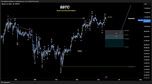 Просування коригуючої хвилі 2 та ведмежої імпульсної хвилі 2 базується на світоглядах біткойна, який не зможе очистити 88,6% опору Фібоначчі на рівні 110 000 доларів. Застосування кількості хвиль Елліотта на поточній ціновій дії показує, що нещодавній поштовх до 111 814 доларів за весь час був більшим бичачим імпульсним хвилею 1. Однак, випливає з цього часу корекція з тих пір у вигляді структури субхвиль 123 та коригувальної схеми ABC. Всього очікується, що вони становлять більшу коригувальну імпульсну хвилю 2.
