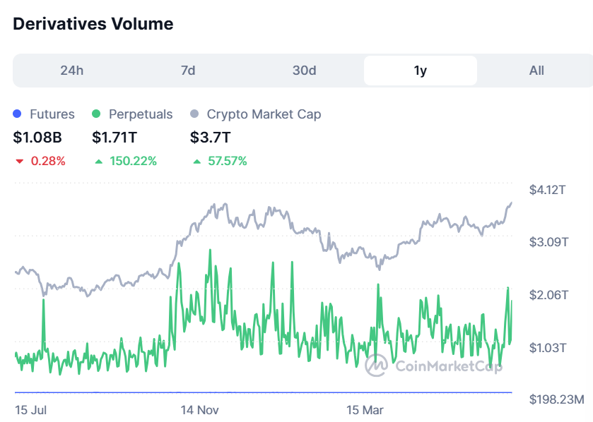 На ринку деривативів постійні контракти зазнали більш швидкого зростання, ніж ф’ючерси, згідно з даними CoinmarketCap. Обсяги на вічних, які є договорами, що не мають терміну придатності, зросли на 150% за останній рік.