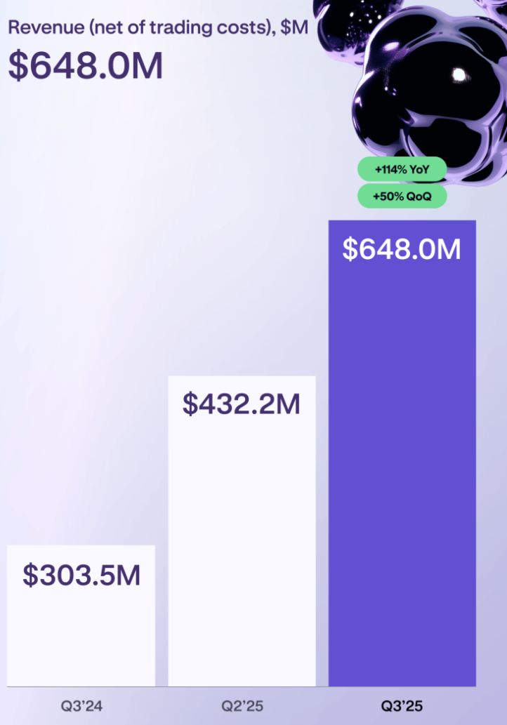 Дохід Kraken за третій квартал 2025 року склав 648 мільйонів доларів, що на 114% більше, ніж роком раніше, і компанія назвала це найсильнішими фінансовими показниками на сьогодні.