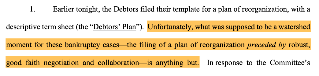 The Debtors filed a template for a plan of reorganization last night. Business level negotiations between the Committee and the Debtors over the terms of the plan have not happened yet, but will start very soon.
