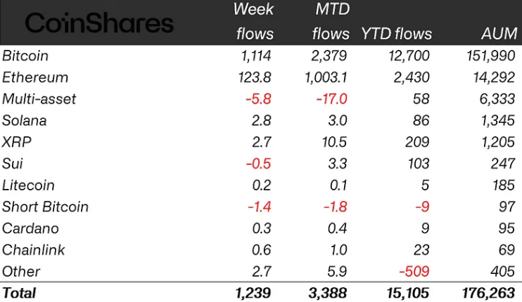 Глобальні продукти з обміну криптовалютами (ETPS) зафіксували 1,24 мільярда доларів припливу за торговий тиждень, що закінчується в п’ятницю, повідомляє Coinshares в понеділок.
